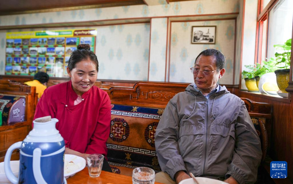 洛桑麥朗(右)在畢業學生開設的店鋪詢問生意情況(8月15日攝)。