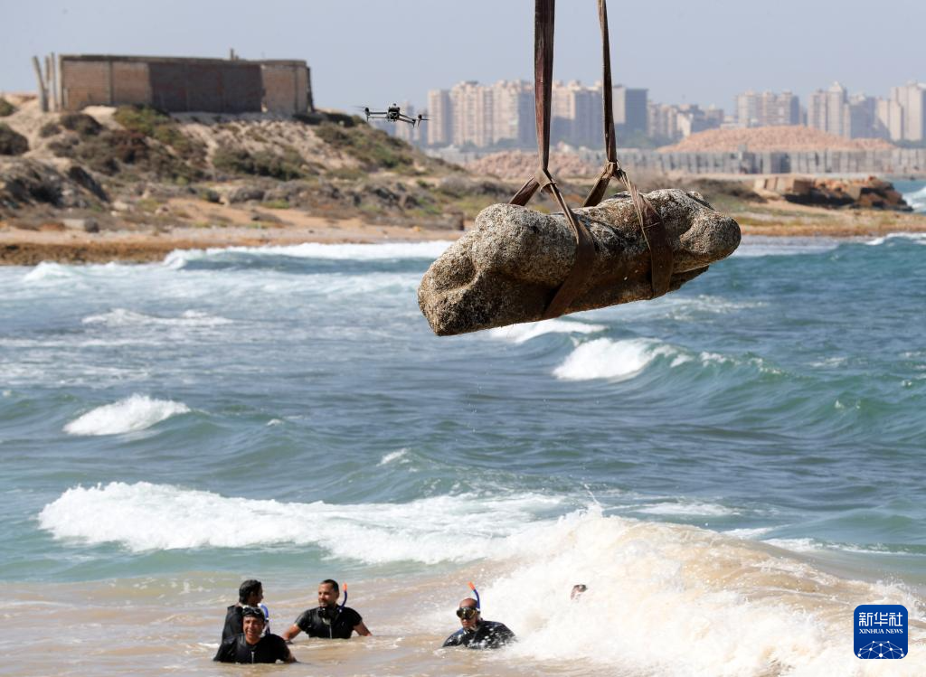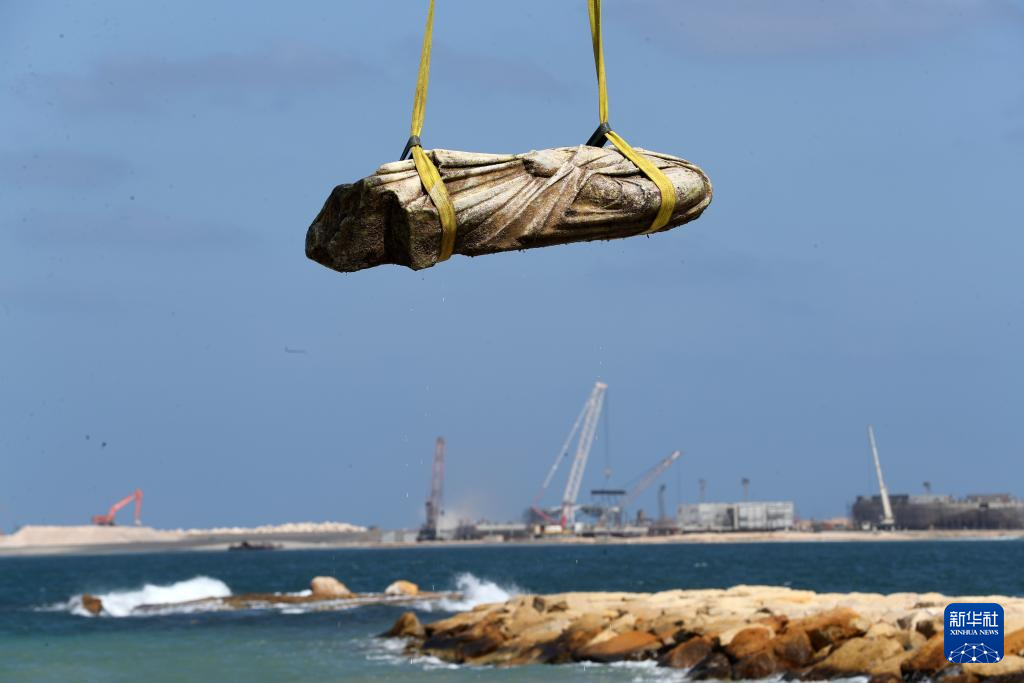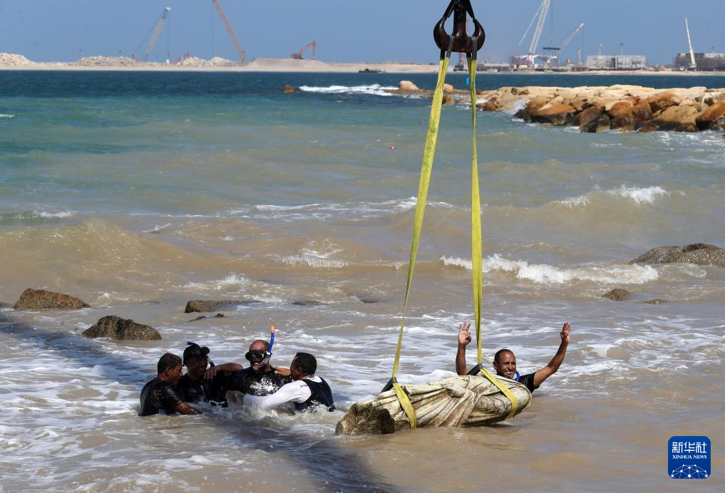 8月21日,在埃及亞歷山大附近的海濱,工作人員幫助安放被打撈出水的石刻雕像。
