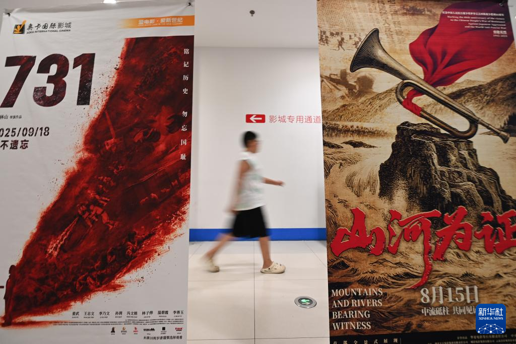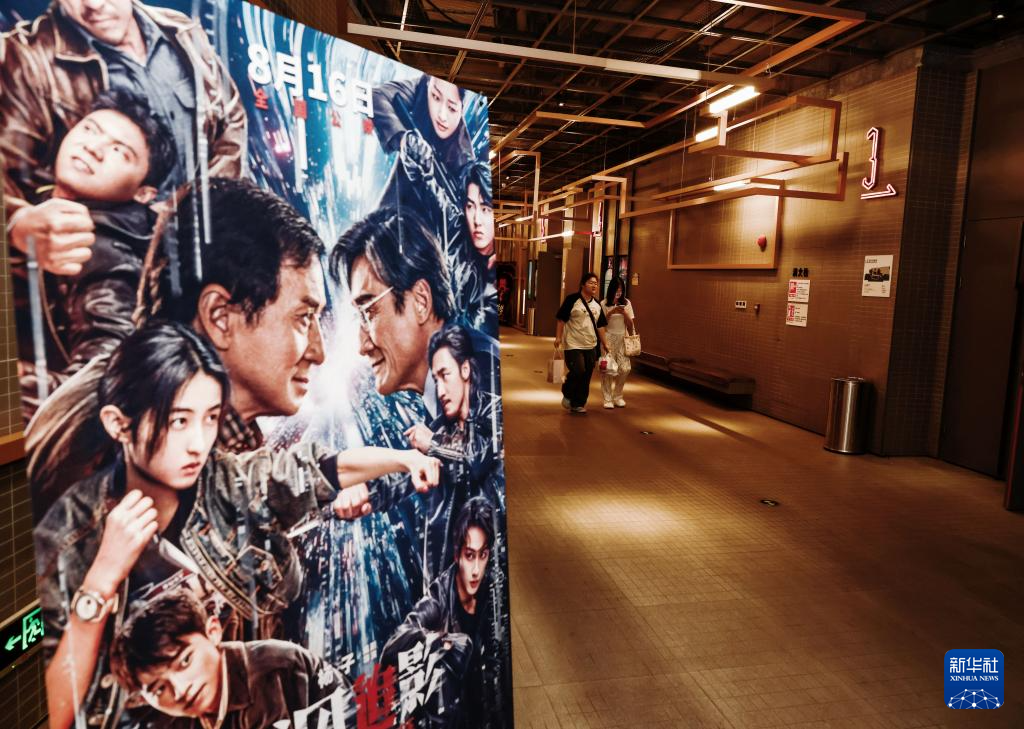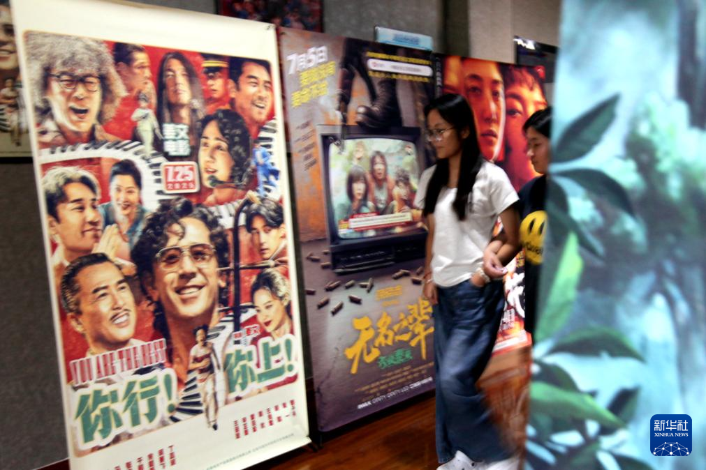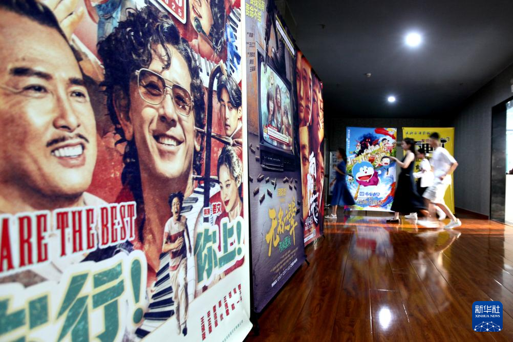8月18日,觀眾在山東省臨沂市平邑縣一家電影院的暑期檔電影宣傳海報前走過。