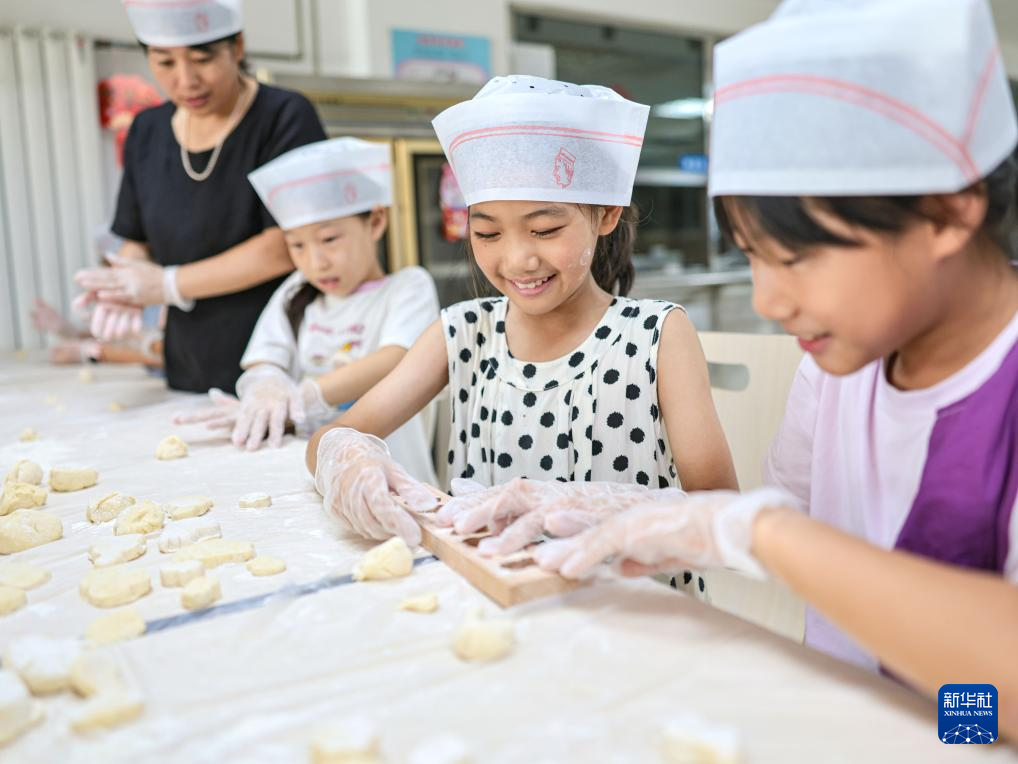 8月26日,在華能山東石島灣核電有限公司生活區食堂,暑期托管班的孩子制作傳統七夕美食巧花。