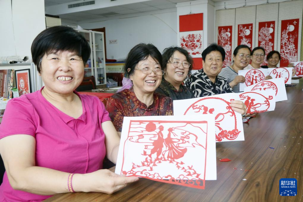8月26日,在河南省洛陽市汝陽縣人民文化館,剪紙藝人展示七夕主題剪紙作品。