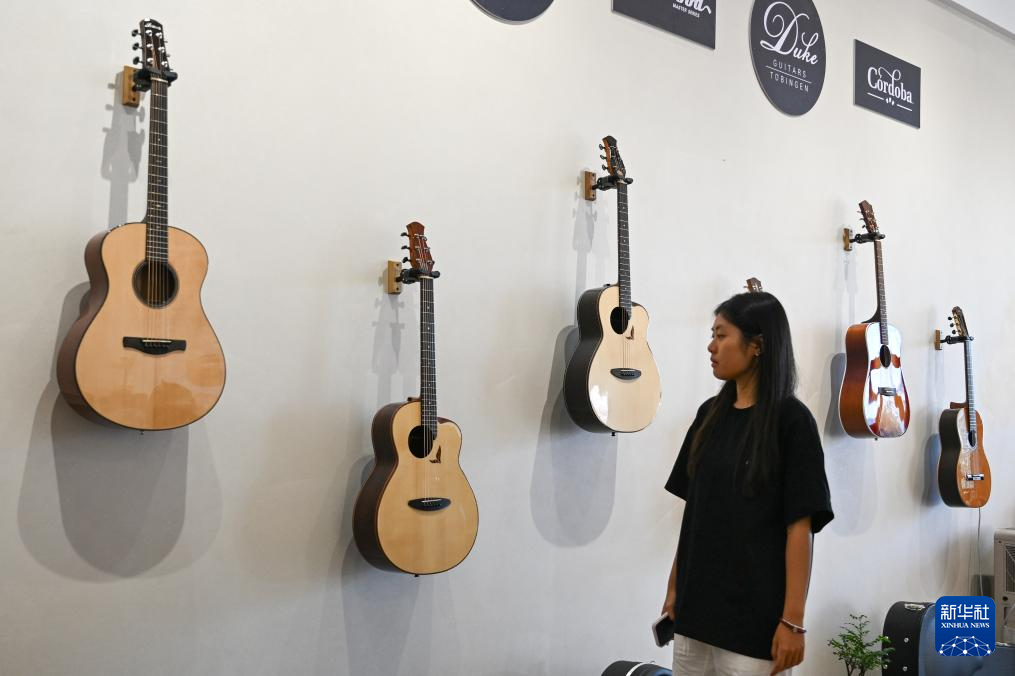 8月28日,參觀者在湖北省松滋市一家吉他企業展廳參觀吉他成品。