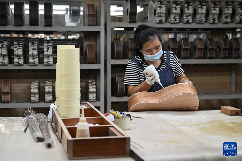 8月28日,在湖北省松滋市一家吉他企業生產車間,工人在制作吉他。