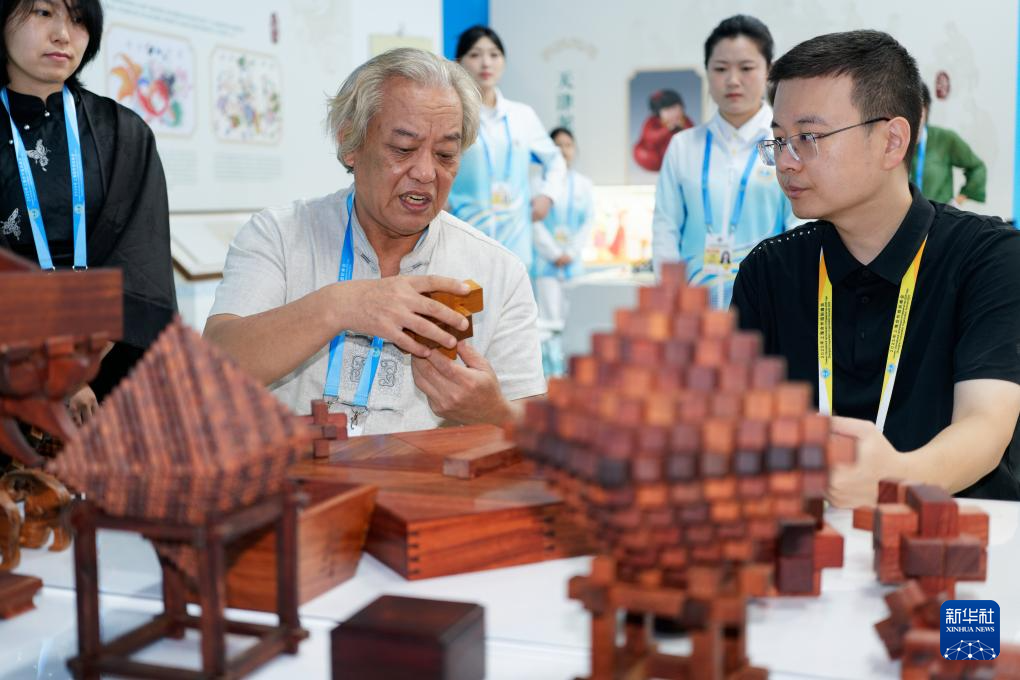8月31日,在峰會新聞中心,傳統木工榫卯技藝非物質文化遺產傳承人辛全生(左二)向參會記者介紹榫卯技藝。