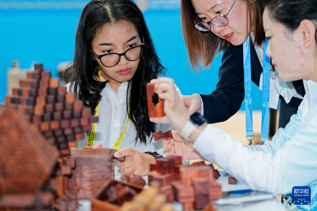 8月31日,一名印度尼西亞記者(左)在峰會新聞中心了解傳統木工榫卯技藝。