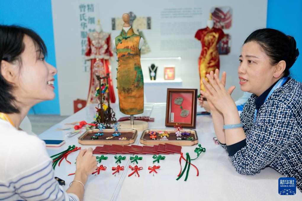 8月31日,工作人員(右)在峰會新聞中心的曾氏華服傳統手工精細制作技藝展臺向記者介紹盤扣胸針制作技藝。