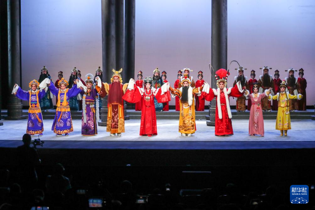 9月5日晚,在蘭州音樂廳,演員在京劇《涼州辭》演出結束后返場謝幕。