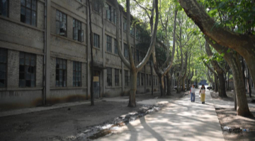 杜德建推開位于山西省永濟市卿頭鎮張坊村的張坊學校大門(9月9日攝)。由于家中圖書越來越多,2015年,杜德建租下村里學校閑置的幾間房屋用于存放圖書、報刊。