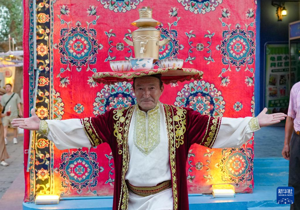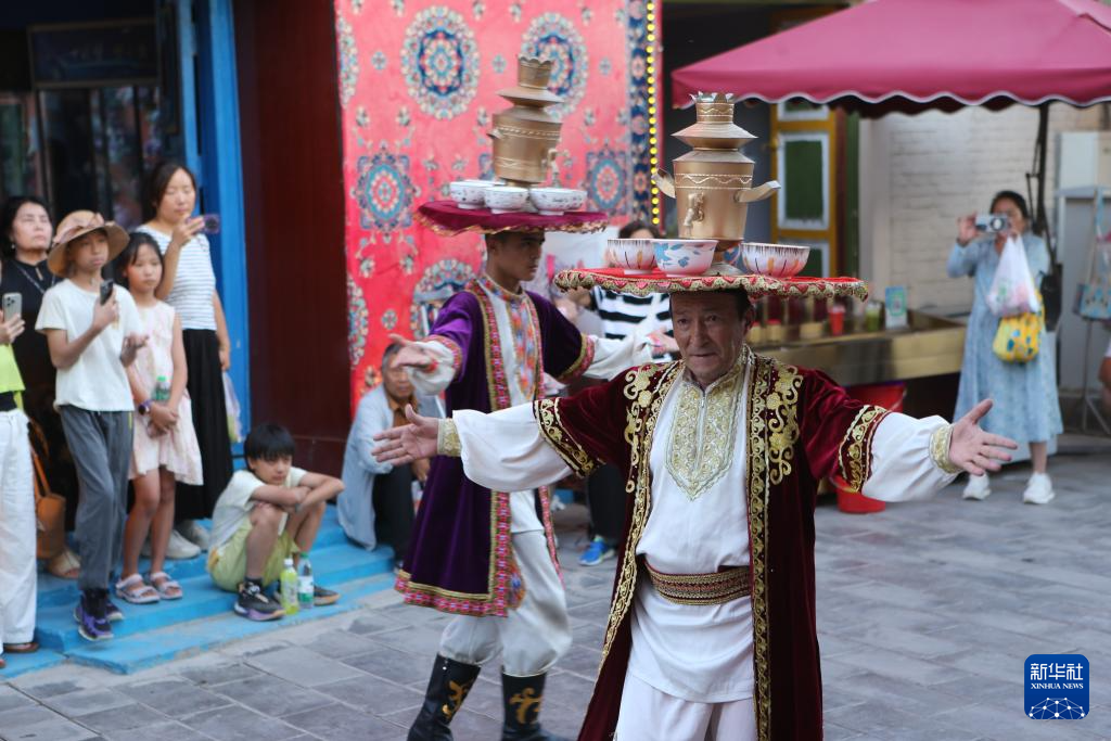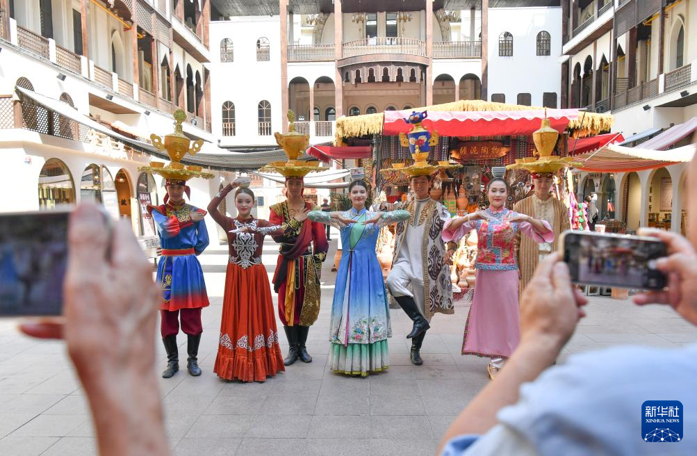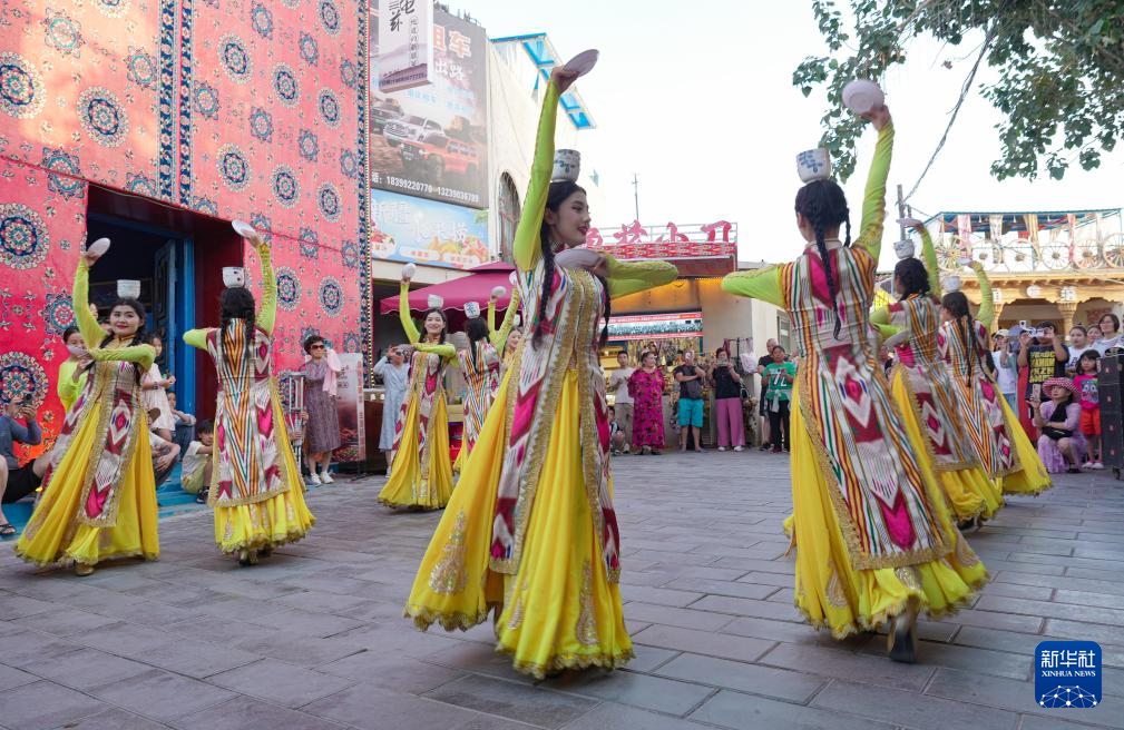 9月9日,在位于新疆烏魯木齊的大巴扎步行街疆來城,演員在表演薩瑪瓦爾舞。