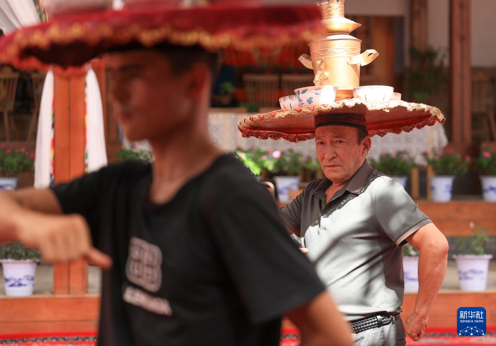 7月22日,在新疆庫車市的龜茲小巷,民間藝人帕爾哈提(右)給年輕舞者教授薩瑪瓦爾舞動作要領。