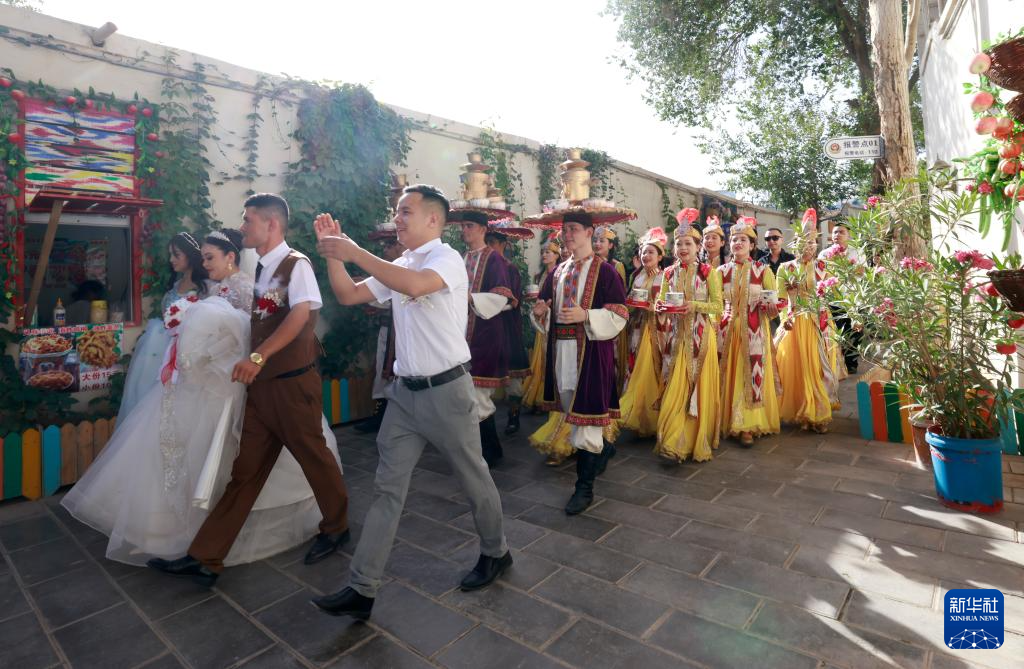 7月22日,在新疆庫車市的龜茲小巷,表演薩瑪瓦爾舞的演員參與當地的一場婚禮活動。