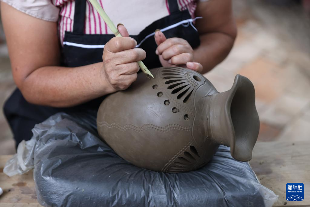 9月14日,在墨西哥瓦哈卡州的圣巴托洛科約特佩克市,一名黑陶手工藝者進行雕刻鏤空。