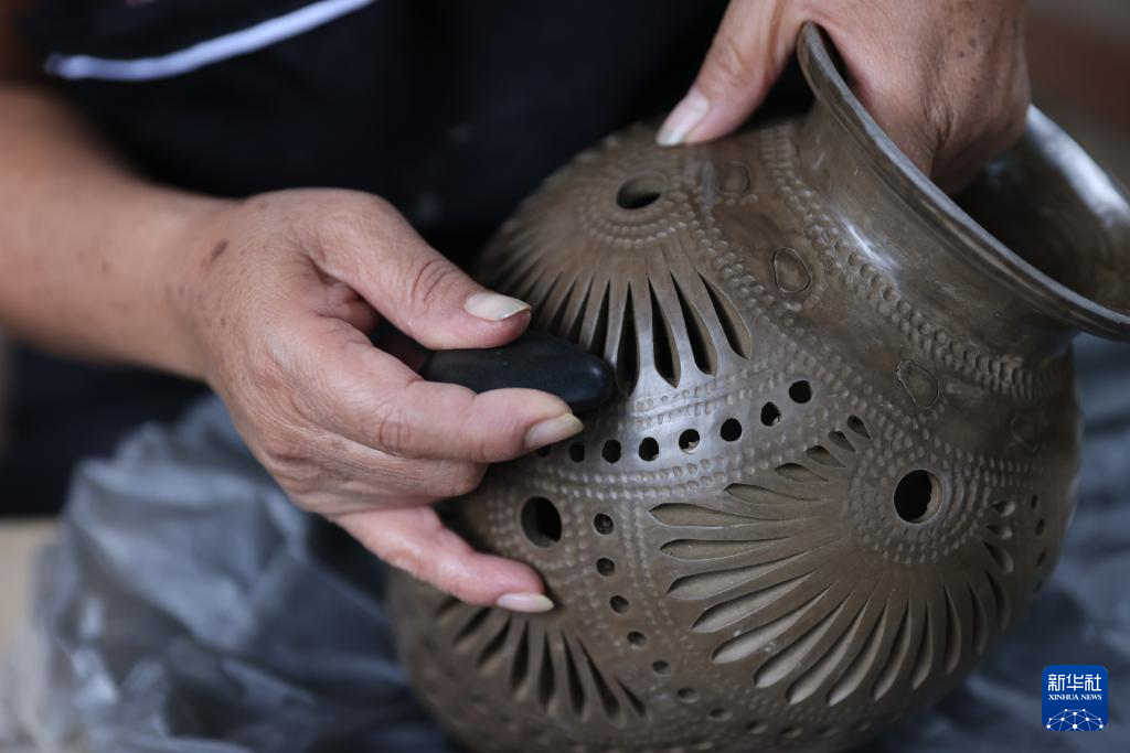 9月14日,在墨西哥瓦哈卡州的圣巴托洛科約特佩克市,一名黑陶手工藝者給陶罐進行拋光。