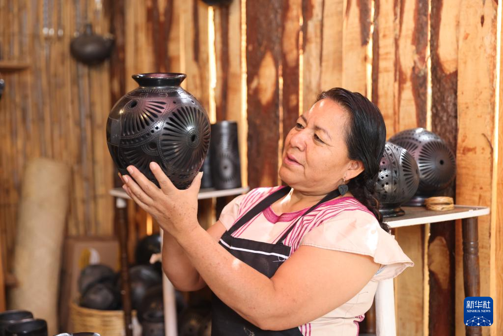 9月14日,在墨西哥瓦哈卡州的圣巴托洛科約特佩克市,黑陶手工藝者展示不同步驟下的黑陶制品。