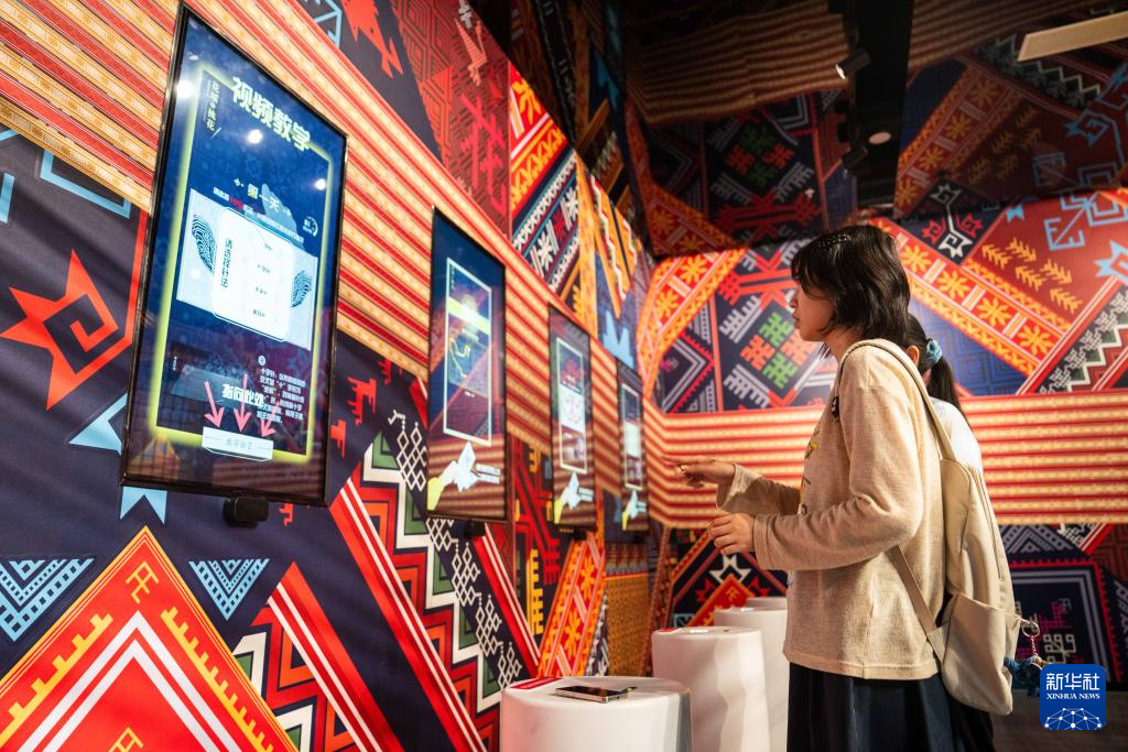 9月16日,在湖南省懷化市五溪非遺園,游客在體驗數字化花瑤挑花。