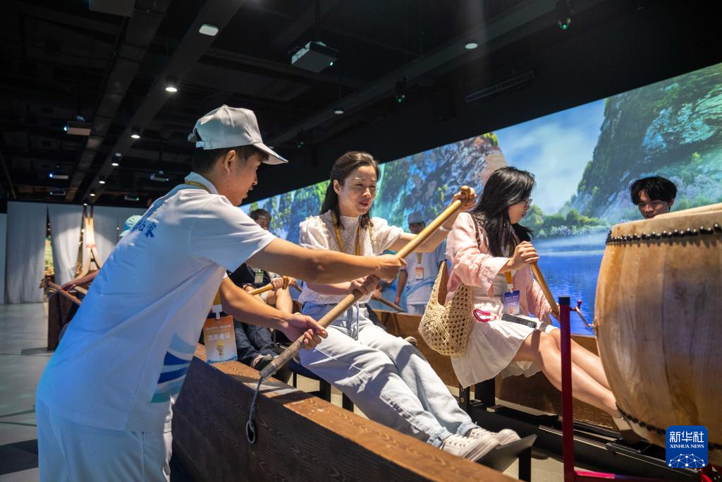 9月16日,在湖南省懷化市五溪非遺園,游客在體驗劃龍舟。