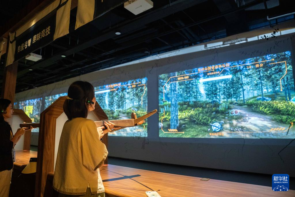 9月16日,在湖南省懷化市五溪非遺園,游客在體驗數字化弓弩。