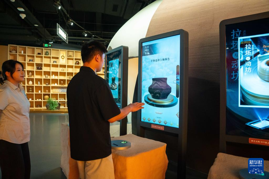 9月16日,在湖南省懷化市五溪非遺園,游客在體驗數字化土陶制作。