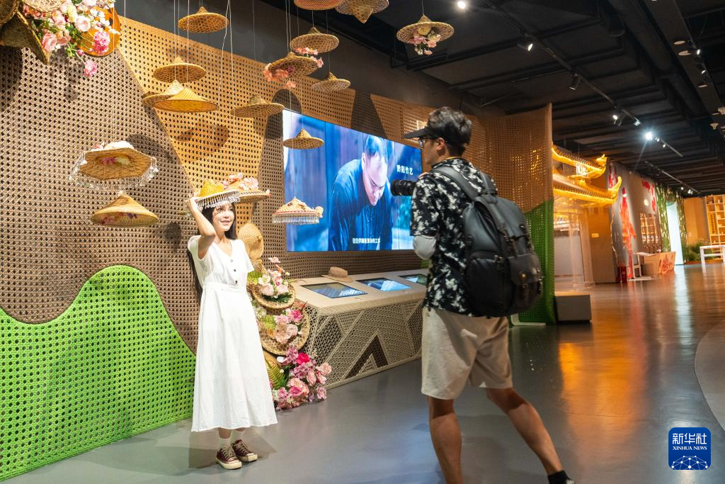 9月16日,在湖南省懷化市五溪非遺園,游客(左)在試戴黔陽竹藝編制的帽子。