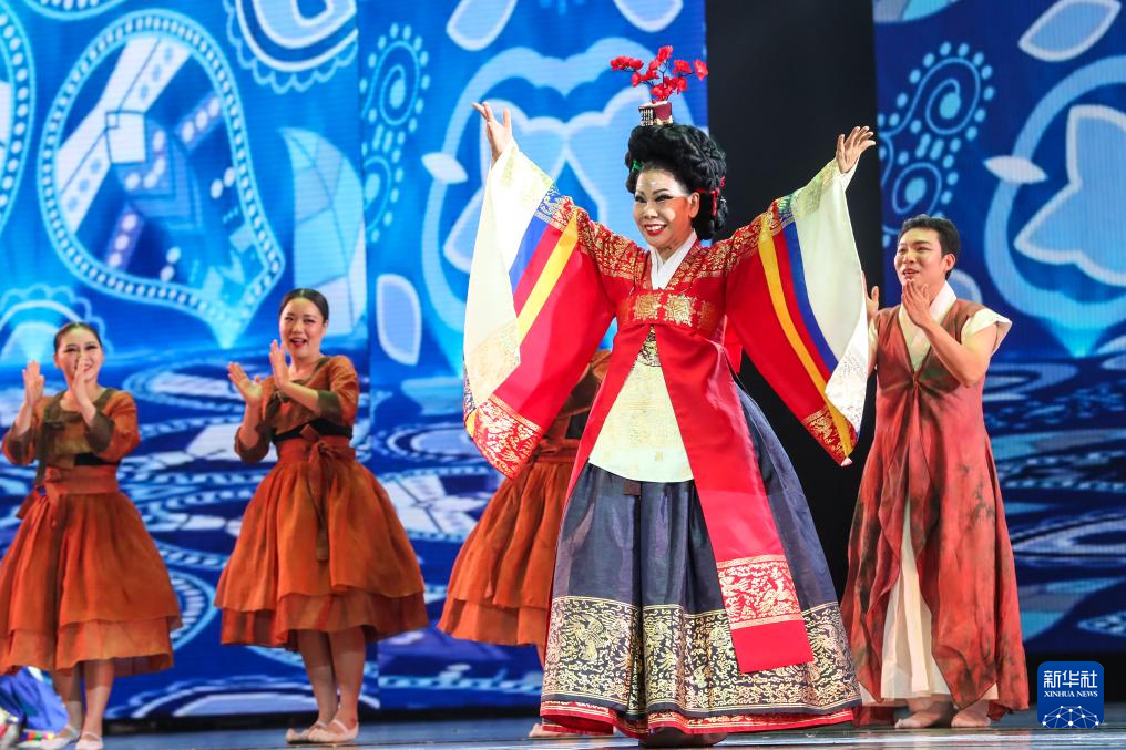 9月22日晚,來自韓國的演員在“相約敦煌”國際文化交流演出活動現場表演民俗舞蹈。