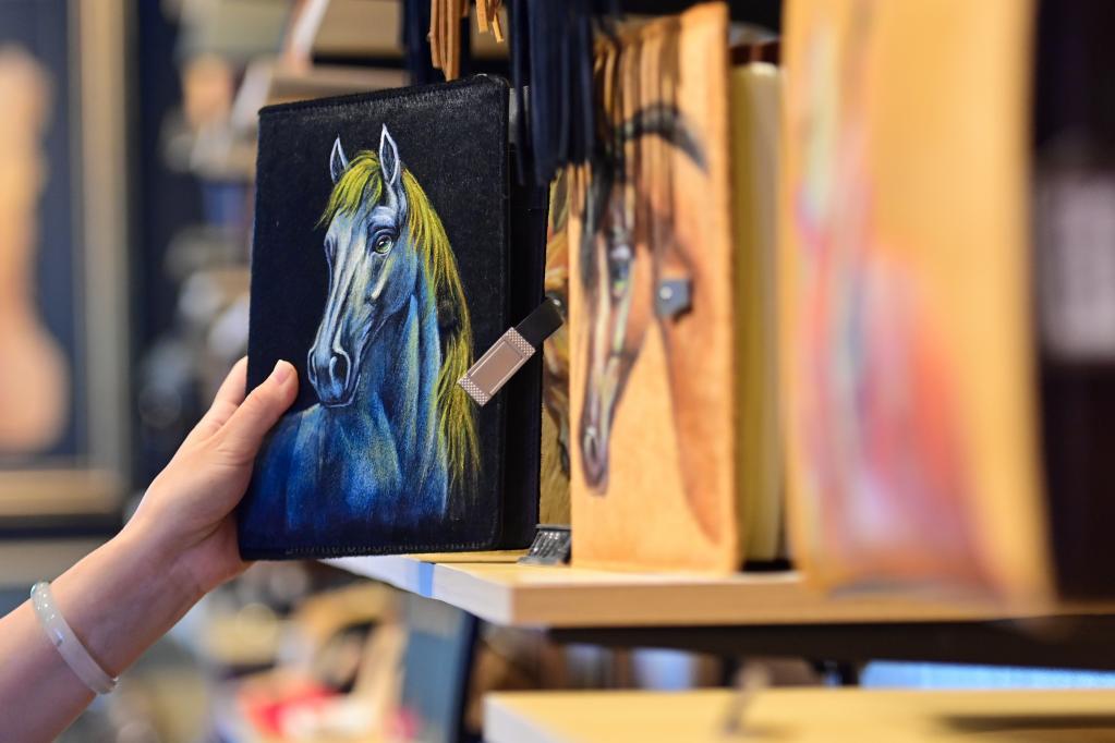 “伊犁是‘天馬之鄉’,我們在皮毛一體的馬皮上進行手工繪畫,每幅圖案都是獨一無二的,讓非遺與旅游深度融合。”店長茹柯耶·艾散介紹,店鋪還開發出馬毛筆記本、首飾等文創衍生品,深受年輕人喜愛。