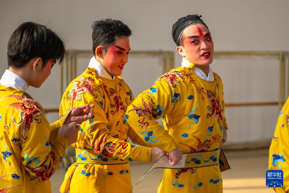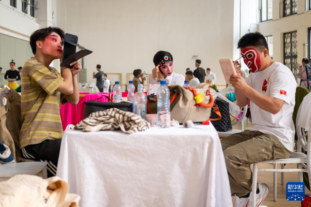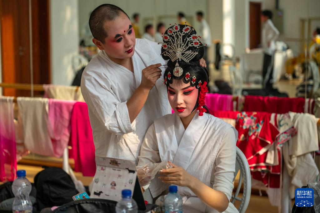 9月25日,在剛果(金)首都金沙薩,來自中國的婺劇演員在后臺化妝備演。