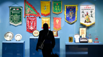 9月27日,在西寧市圣源地毯集團有限公司生產車間,一名操作工從展示的藏毯前走過。