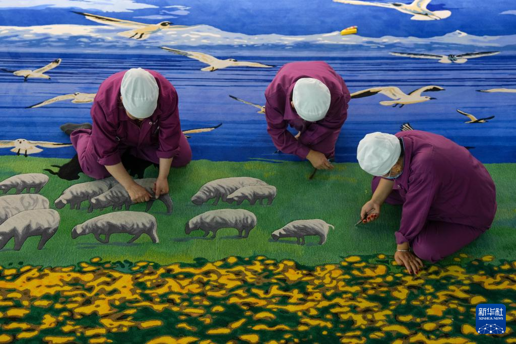 9月27日,在西寧市圣源地毯集團有限公司生產車間,三名操作工在制作藏毯。