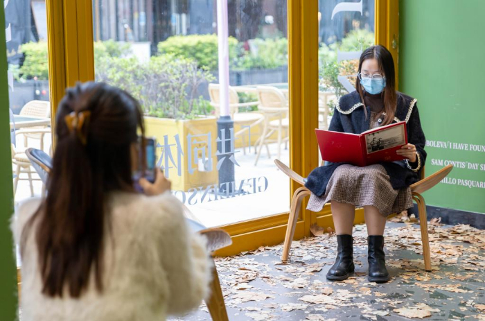 11月19日,人們在上海市徐匯區西岸藝術中心附近一家書店內閱讀拍照。