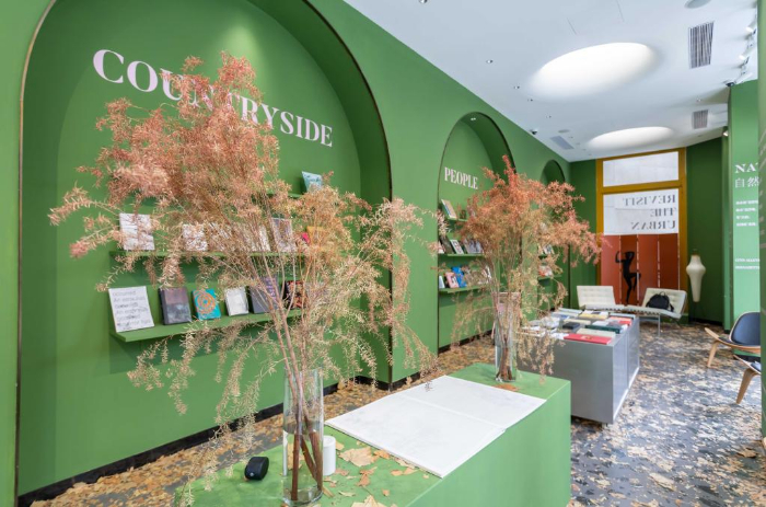 11月19日,在上海市徐匯區西岸藝術中心附近一家書店內,落葉被布置在各個角落。