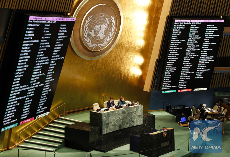 Photo taken on Dec. 21, 2017 shows the voting of a United Nations General Assembly resolution on the status of Jerusalem during a rare emergency special session at the UN headquarters in New York. The General Assembly on Thursday adopted a resolution on the status of Jerusalem that will make U.S. President Donald Trump's decision to recognize Jerusalem as the Israeli capital have no legal effect. (Xinhua Photo)