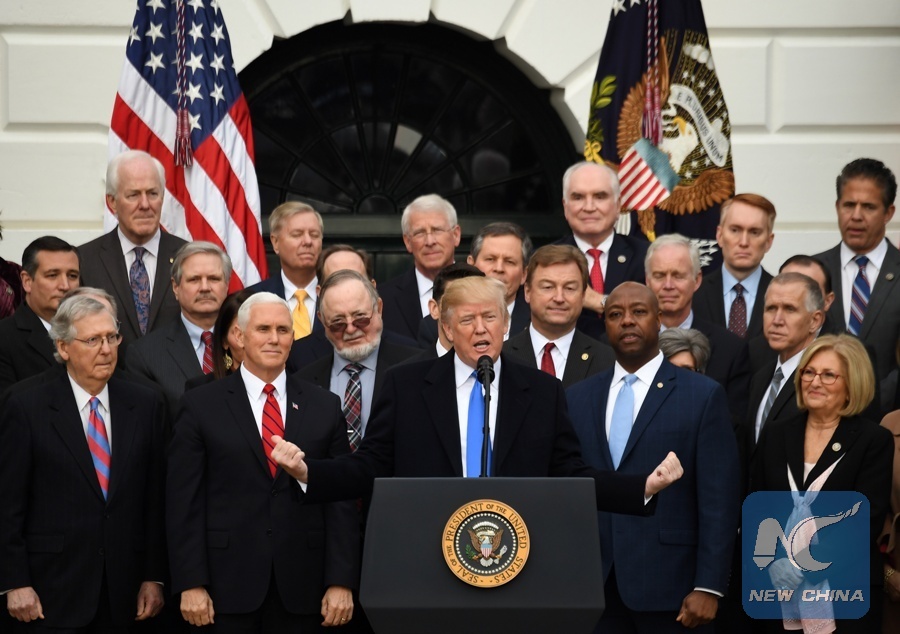 The GOP-led Congress this week passed a sweeping 1.5-trillion-U.S.-dollar tax overhaul, which cuts taxes for corporations, small businesses and individuals. The bill amounts to the biggest tax revamp in three decades, and was a much-needed legislative win after Trump's earlier failure to pass a massive healthcare bill.