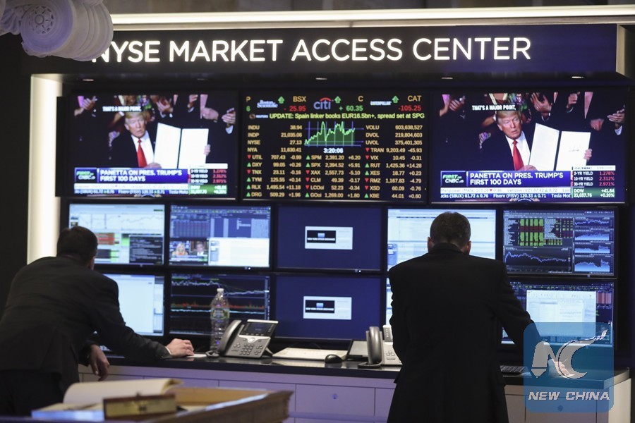 Traders work at the New York Stock Exchange in New York, the , on April 26, 2017. (Xinhua/Wang Ying)