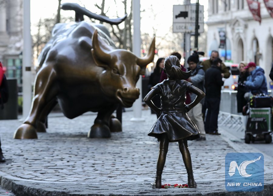 Photo taken on March 9, 2017 shows the "fearless girl" statue facing the bronze bull statue near the Wall Street in New York, the United States. (Xinhua/Wang Ying)