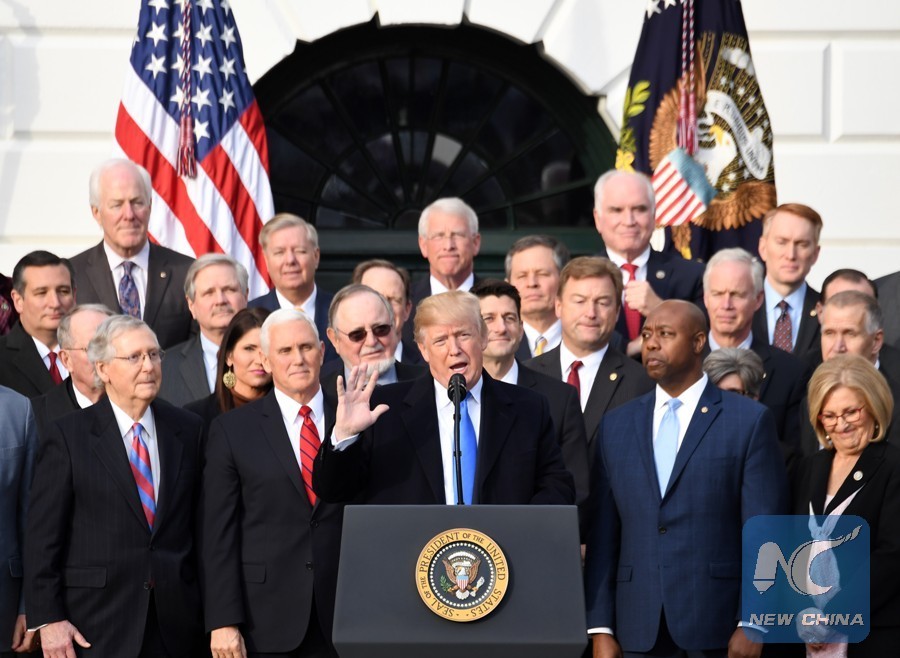 U.S. President Donald Trump (C) speaks at an event celebrating the passage of the tax bill on the South Lawn of the White House in Washington D.C., the United States, on Dec. 20, 2017. (Xinhua/Yin Bogu)