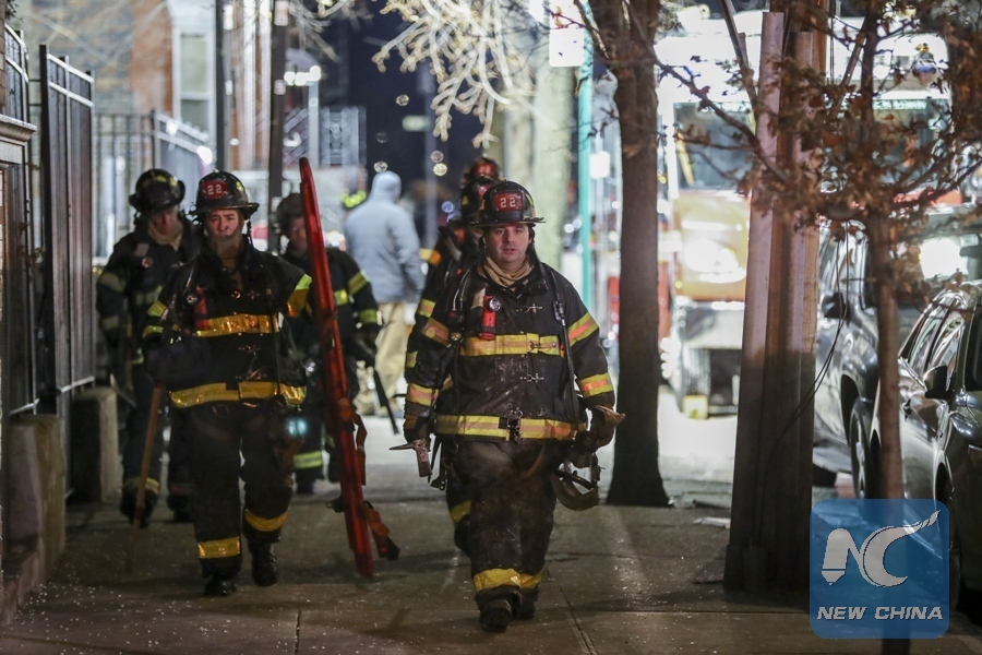 Firefighters walk at the site of an apartment fire in Bronx, New York, the , Dec. 29, 2017. (Xinhua/Wang Ying)