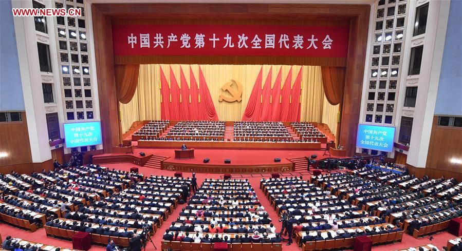 Xi Jinping delivers a report to the 19th National Congress of the Communist Party of China (CPC) on behalf of the 18th Central Committee of the CPC at the Great Hall of the People in Beijing, capital of China, Oct. 18, 2017. The CPC opened the 19th National Congress at the Great Hall of the People Wednesday morning. (Xinhua/Li Tao)