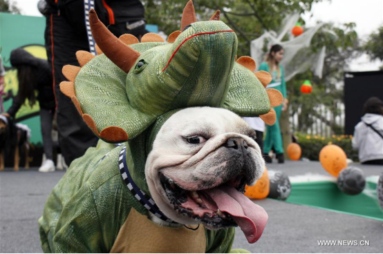 A dog participates in a pet's Halloween parade called "Canoween 2017" in Lima, Peru, on Oct. 29, 2017. (Xinhua/Luis Camacho)