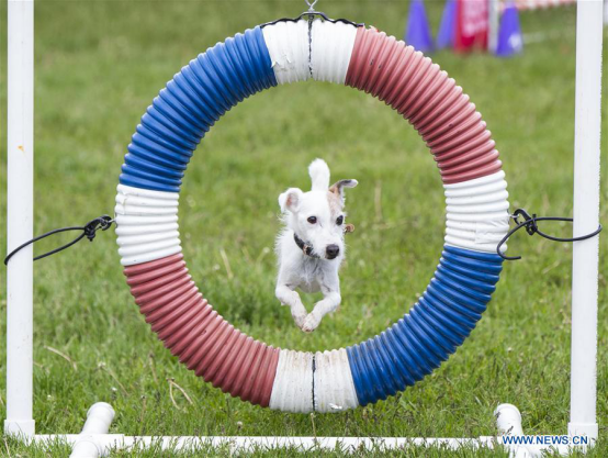 A pet dog jumps through a hoop during the training event of the 2017 Woofstock at Woodbine Park in Toronto, Canada, May 27, 2017. (Xinhua/Zou Zheng)
