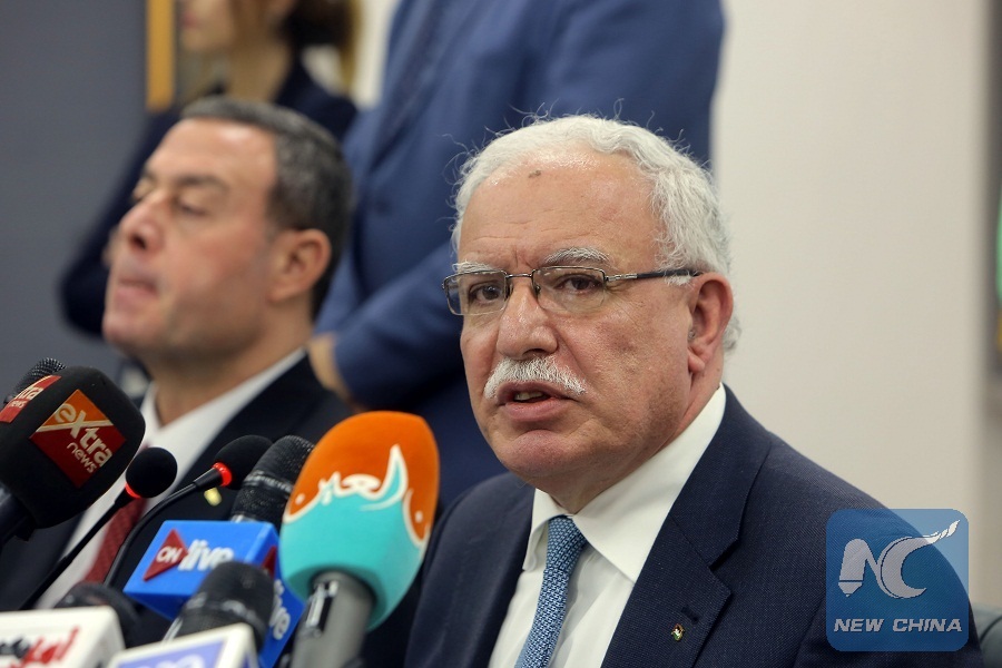 Minister of Foreign Affairs of the Palestinian National Authority (PNA) Riyad al-Maliki (R) speaks during a press conference on U.S. President Donald Trump's decision to recognize Jerusalem as the capital of Israel, in Cairo, Egypt, on Dec. 9, 2017. (Xinhua/Mohamed Assad)