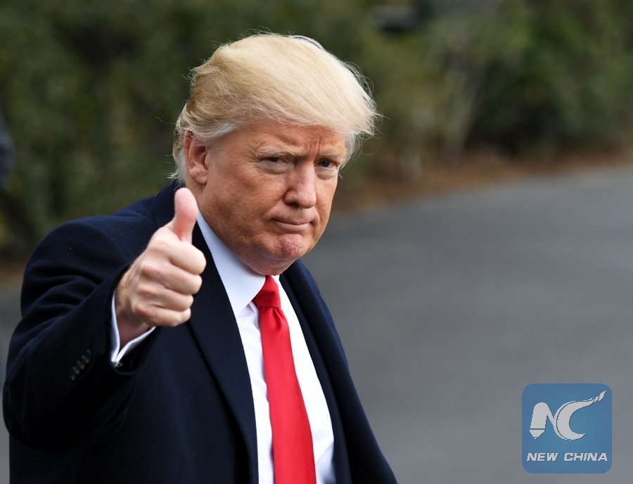 U.S. President Donald Trump gestures to media before boarding Marine One departing for Andrews Air Force Base en route to West Palm Beach, Florida, at White House in Washington D.C.,the United States, Feb. 3, 2017. (Xinhua/Yin Bogu)