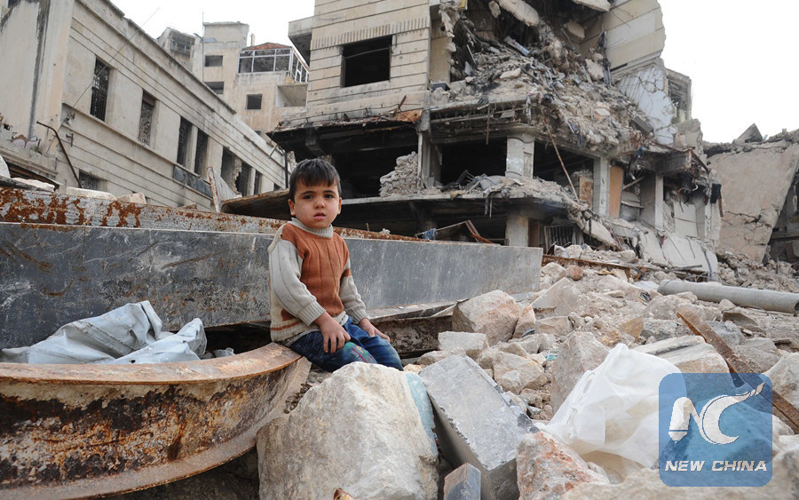 A boy sits amid the rubble in the largely destroyed part of Aleppo city in northern Syria, Dec. 21, 2017. (Xinhua/Ammar Safarjalani)