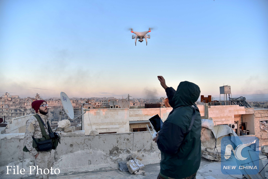 A n government soldier controls a drone to investigate the rebel-held area in Aleppo, Syria on Dec. 18, 2016. (Xinhua/Yang Zhen)