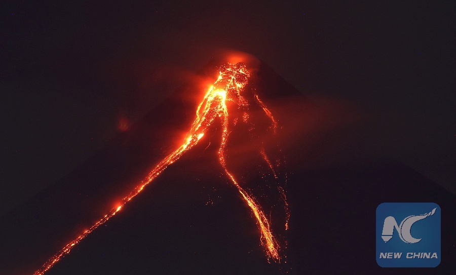 Glowing lava is seen as it flows from the crater of Mayon Volcano in Albay Province, the , Jan. 15, 2018. (Xinhua/Stringer)