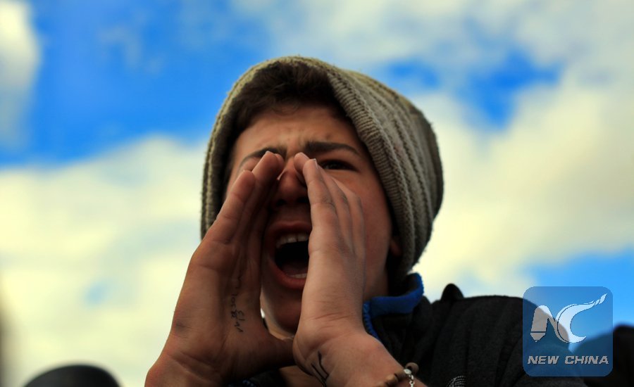 A protester shouts slogans near the U.S. Embassy in Amman, Jordan, on Dec. 7, 2017. People took part in demonstrations in Jordan to protest against U.S. President Donald Trump's decision to recognize Jerusalemas the capital of Israel and move the U.S. Embassy from Tel Aviv to Jerusalem. (Xinhua/Mohammad Abu Ghosh)
