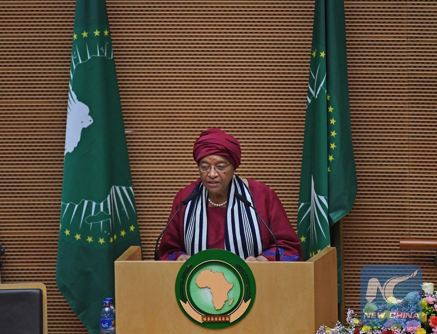 File photo shows Liberian President Ellen Johnson Sirleaf addressing the closing session of the 29th summit in Addis Ababa, capital of Ethiopia, on July 4, 2017. (Xinhua/Chen Cheng)