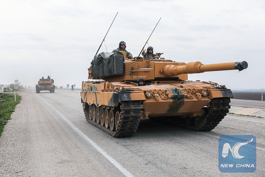Turkish armored vehicles run near the n-Turkish border at Reyhanli district in Hatay, Turkey, on Jan. 21, 2018. (Xinhua)