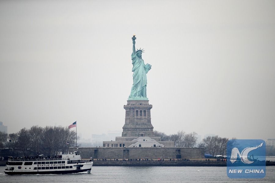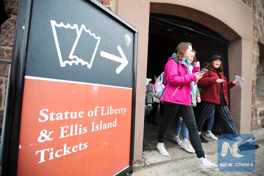 Tourists visit the Statue of Liberty on Liberty Island in New York, the , Jan. 22, 2018. New York City's iconic landmark the Statue of Liberty reopened Monday at the expense of state funds following a brief closure as a result of the U.S. federal government shutdown. (Xinhua/Wang Ying)