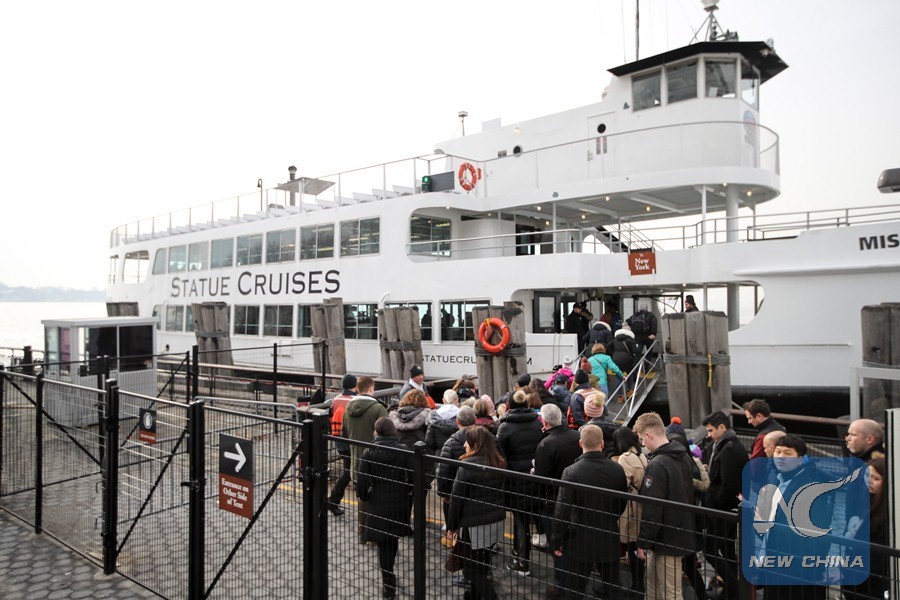 Tourists get onboard the cruise to visit the Statue of Liberty and Ellis Island in New York, the United States, Jan. 22, 2018. (Xinhua/Wang Ying)