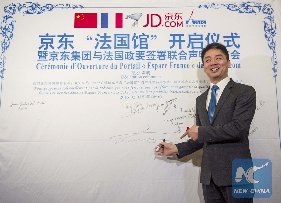 Liu Qiangdong, CEO of e-commerce company JD.com, takes part in the launch ceremony of the French goods department of JD.com, in Paris, , Feb. 3, 2015. (Xinhua/Cheng Xiaowei)